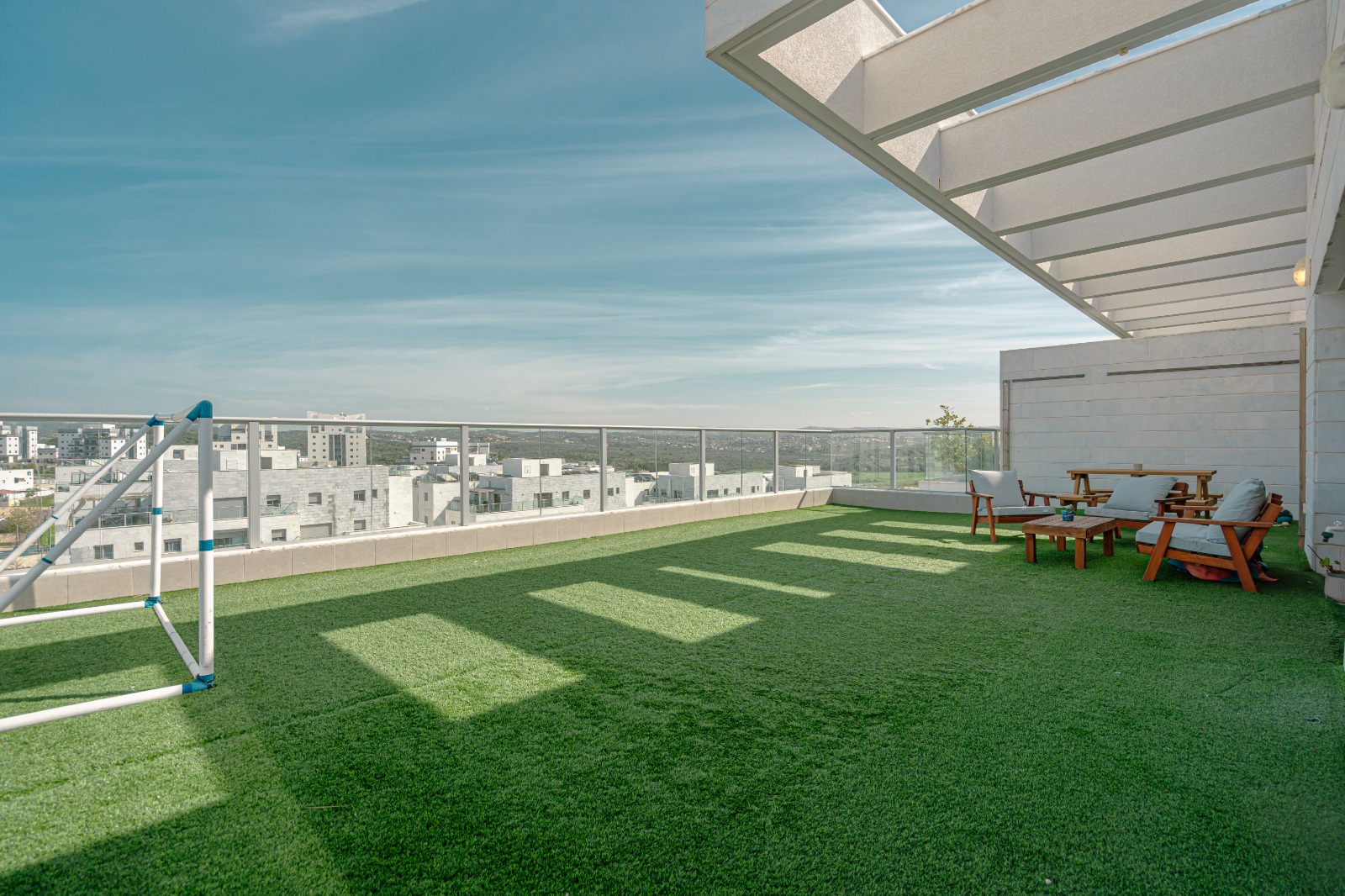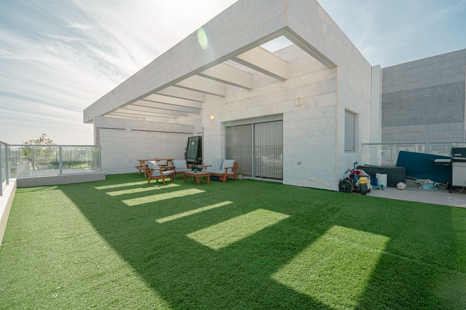 מרפסת גדולה מרוכזת ומרווחת מוארת ומתוככנת היטב
